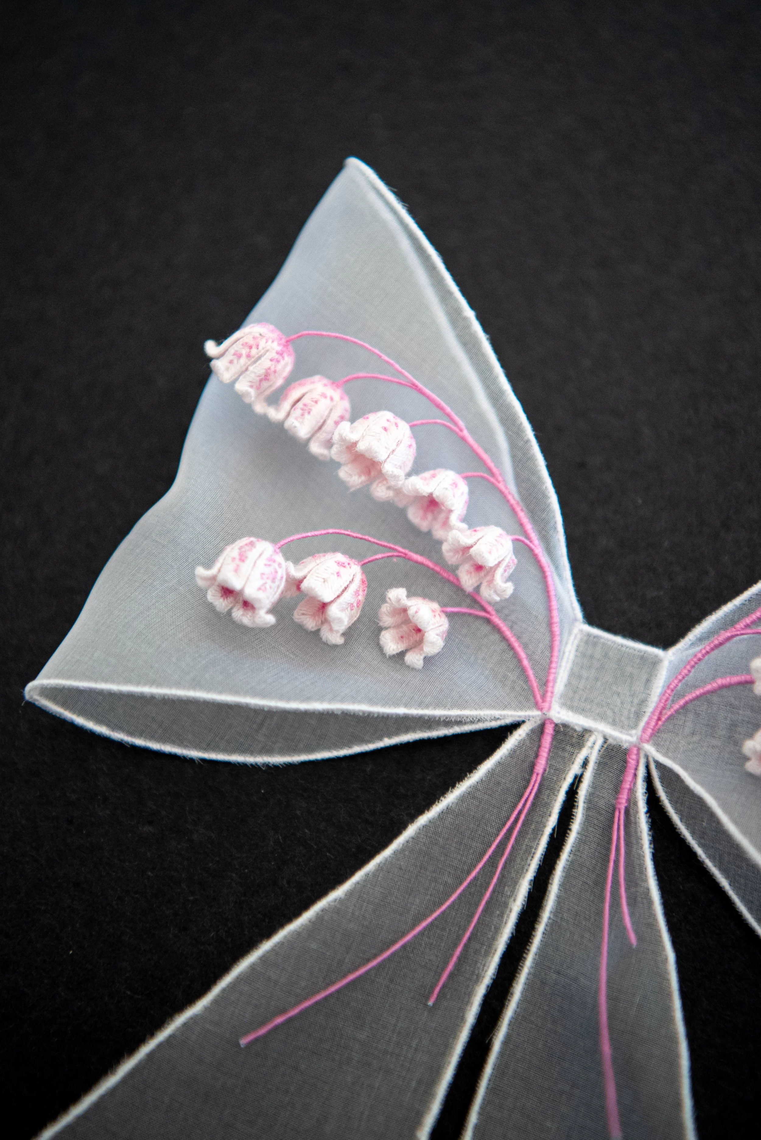 A pigeon gifts a lily of the valley flower to his favourite pigeon who is chuffed to receive such a gift. Pigeons have been stitched with silk shading. 3-D flowers are wired slips and made from satin stitch and tiny French knots.