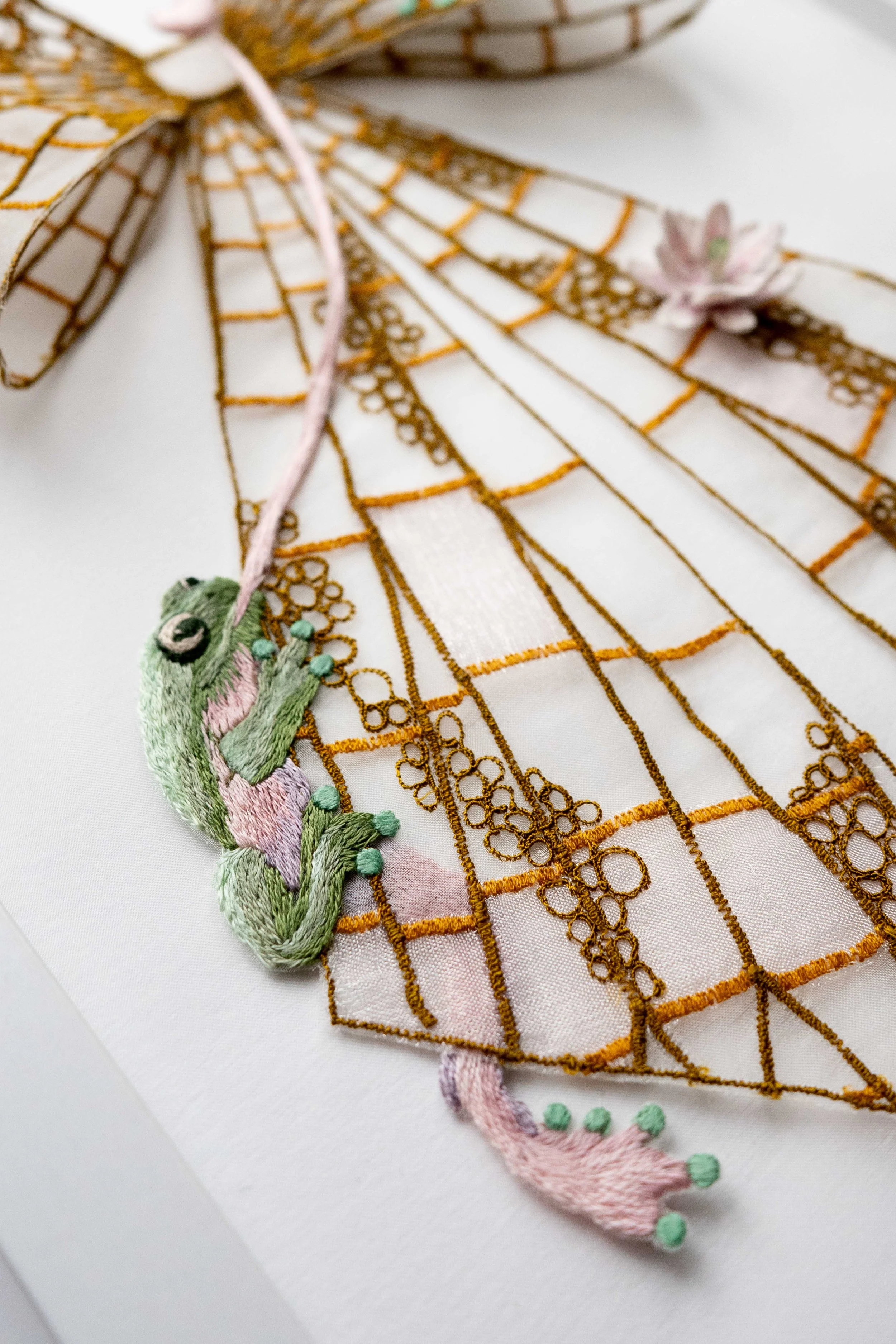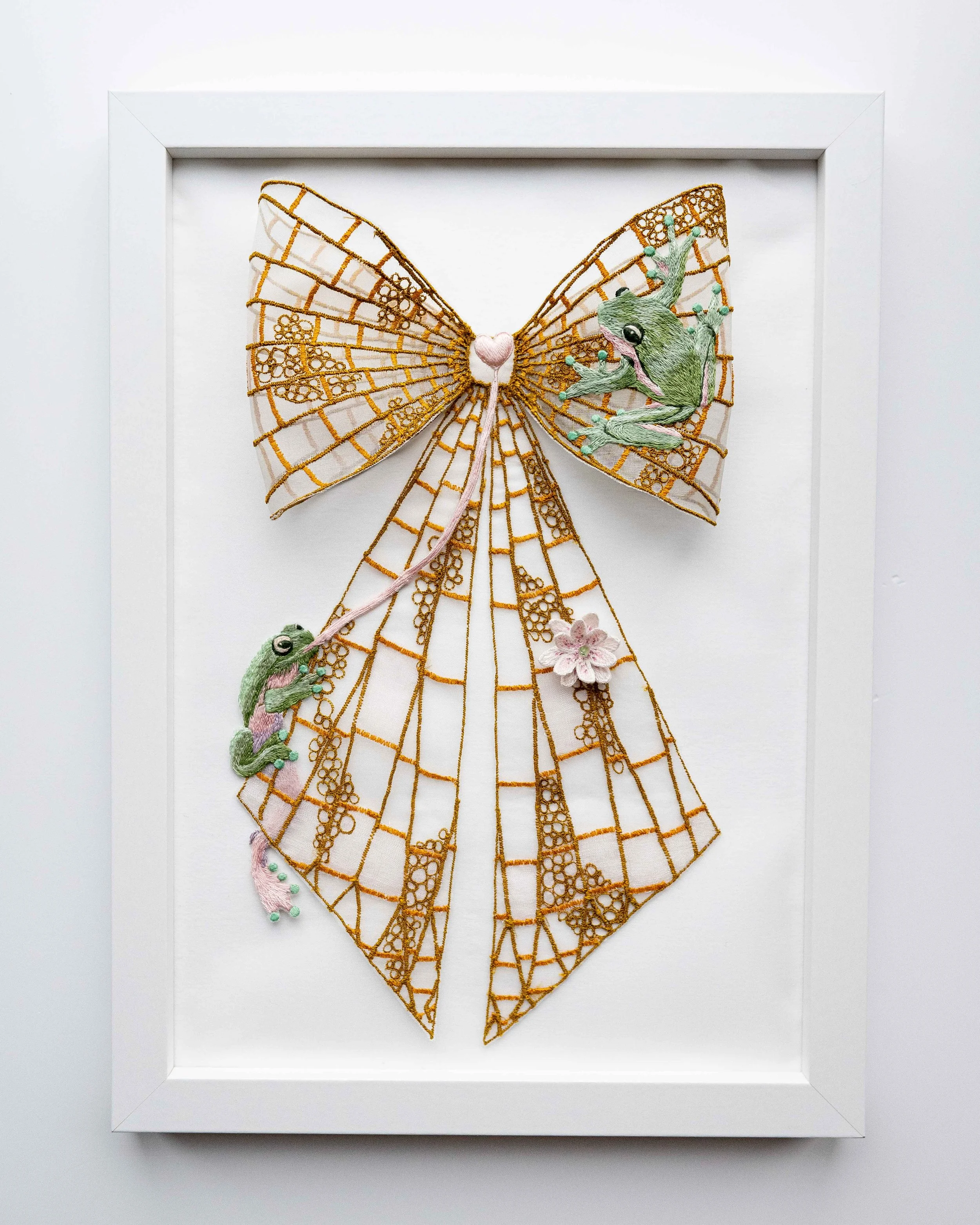 You’ve Got Me Tongue-Tied is a love story between frogs. The hand embroidered frogs with wired stumpwork tongue and lily flower, pose on a wired, free machine embroidered bow. The pattern in the bow is inspired by the texture of a lily pad and includes sections of shimmering applique to represent water on the surface. My work is often centred around celebrating love and told through the perspectives of nature. I like to use bows as my canvas for their romantic connotations and historic cultural significances, for example “tying-the knot” means to marry and has origins in ancient Celtic customs.